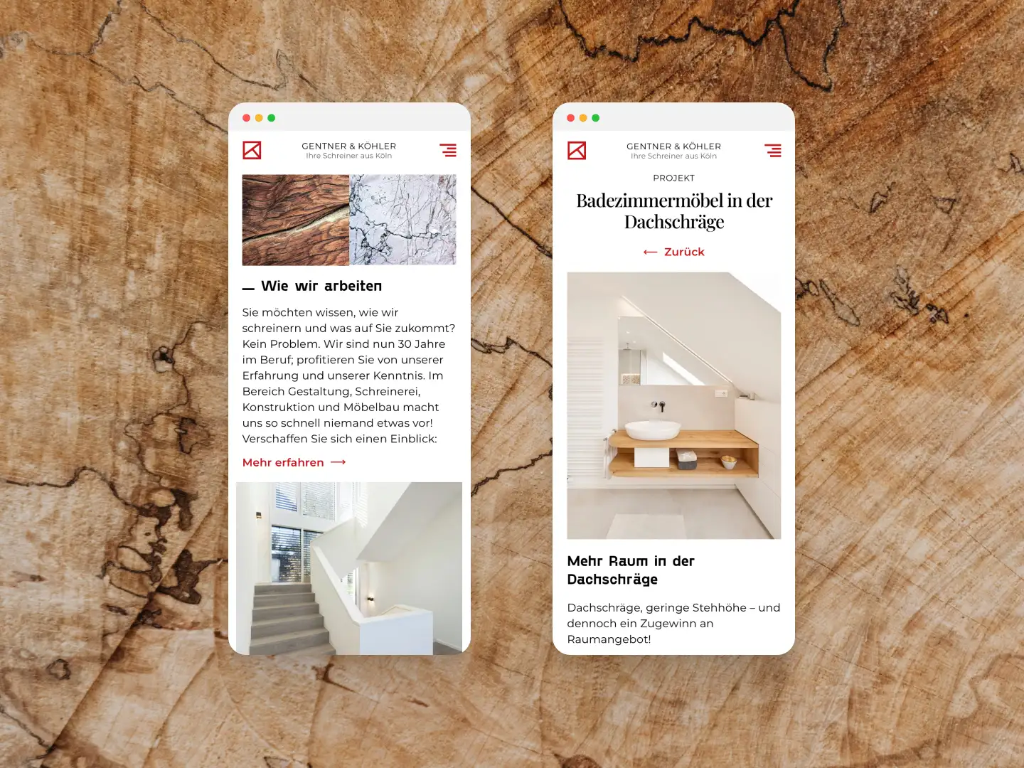 Für die beiden Schreinermeister Daniel Gentner und Sebastian Köhler aus Köln-Ehrenfeld entstand ein komplett neues Webdesign – klar, modern und mit Fokus auf Neukundengewinnung. In mehreren persönlichen Gesprächen entwickelten wir den Entwurf gemeinsam weiter, bis er genau zu ihrem Anspruch passte. Die Umsetzung erfolgte in WordPress, vollständig responsiv und suchmaschinenfreundlich. Das Ergebnis überzeugt: Gentner & Köhler konnten damit neue Kundinnen und Kunden gewinnen – und ihr Handwerk im besten Licht präsentieren.